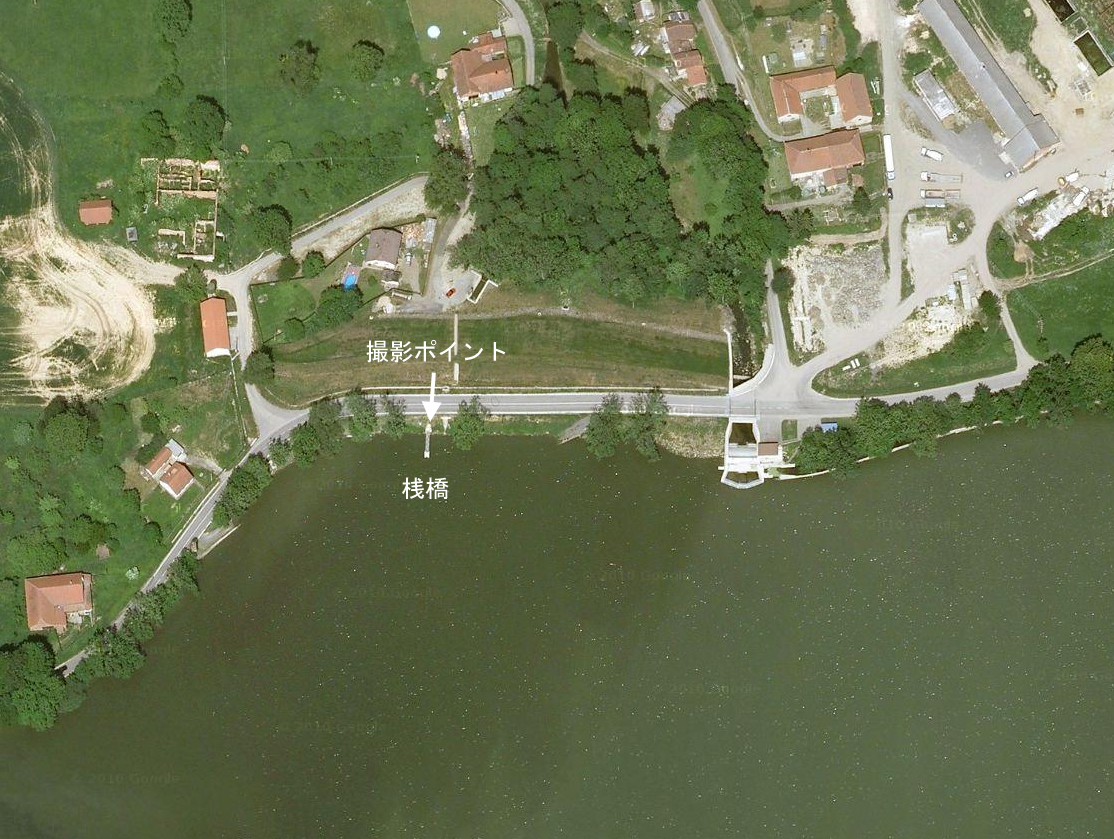 ノヴィ池を上から見るとこのようになっています。 この水がチェコ国内をめぐり、エルベ川となってドイツを北上し、北海に注ぎます。 女性が立つ桟橋は取水口の横にあります。 写真をクリックすると桟橋部分の拡大写真が見えます。