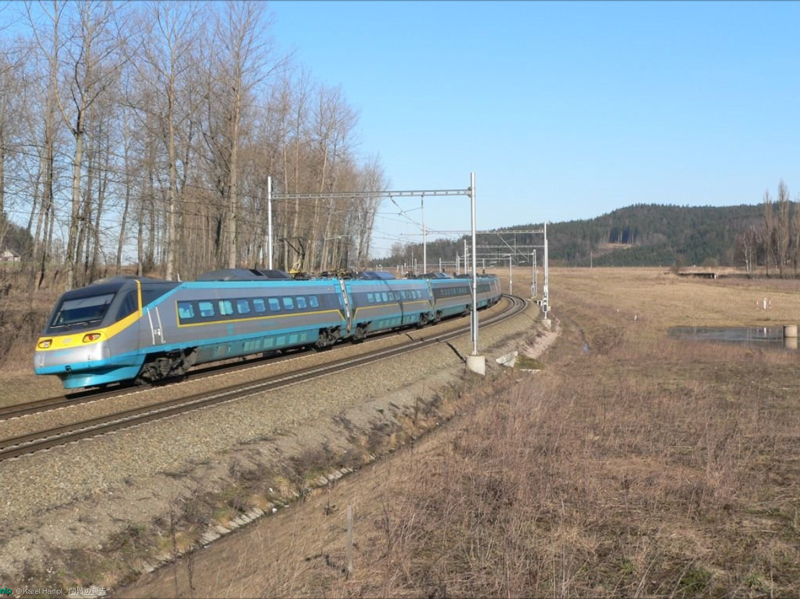プラハ駅 (Praha hlavní nádraží) を 10:39 に出発したウィーン行きの特急列車 EC77 Antonín Dvořák は パルドビツェ 11:37、チェスカ・トジェボヴァ 12:17 に途中停車し、その直後の 12:20 にトジェボヴィチェ駅を通過します。 ウィーン新駅到着は 15:55。