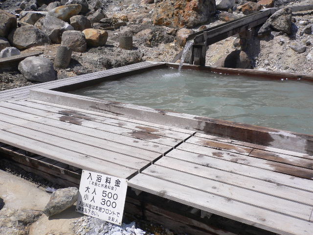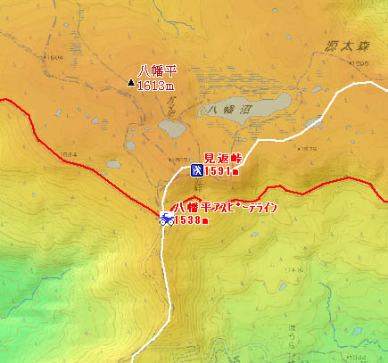 アスピーテラインの最高点のレストハウス駐車場は分水嶺上にある 八幡平(百名山 1,613m)頂上は正面小高いところ。地形図に示される見返峠はここから北東にある 2002年8月