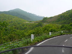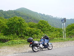 禿(かしら)岳の東側に広がる禿高原の鬼首ゴルフクラブの横を通過し町営牧場を横切る県道を登り詰めると広々とした花立峠である 県道であるために、宮城県(右側後方)と山形県(左側前方)の県境で道路の補修・整備状態が異なっている