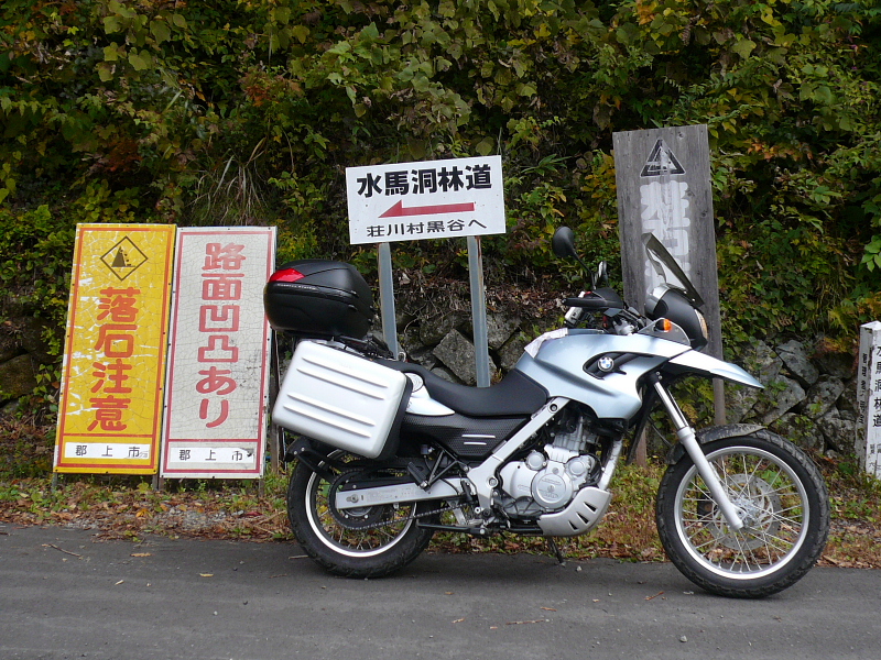 めいほうスキー場脇を抜けて一般道と出会う地点の注意看板。