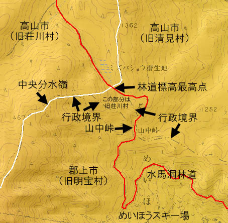 この水馬洞林道の標高最高地点が分水嶺であるが、地形図上の「山中峠」(標高約1290m)はこの地点から約700m南東へ行ったところで岐阜県高山市(旧大野郡清見村)と岐阜県郡上市(旧郡上郡明宝村)の行政境界(中央分水嶺ではない)である。 この地点の詳細は図の通り。