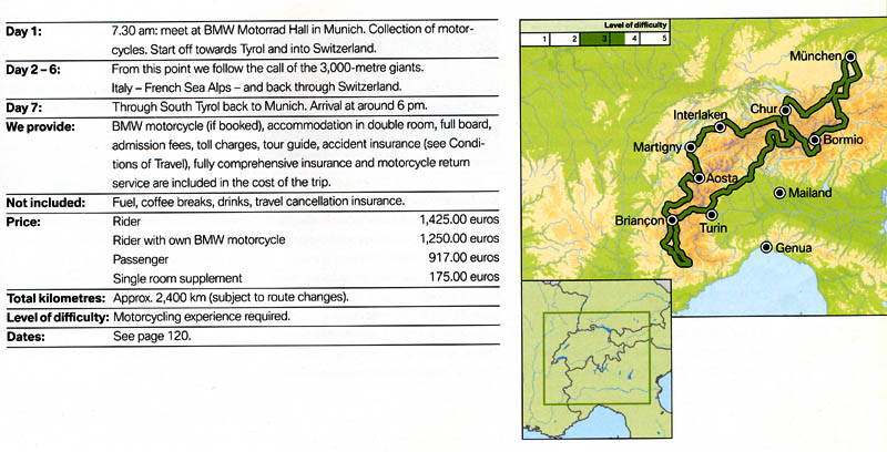 社のバイクツアー』である)の中の「アルプス峠越え7日間」で、6月20日にドイツのミュンヘンを出発してアルプス山中に入りスイス・オーストリア・イタリア・フランスの各国の国境を行き来してヨーロッパアルプスの峰々をつなぐ数多くの有名な峠を越え、またミュンヘンに戻ってくる2000キロの旅である。