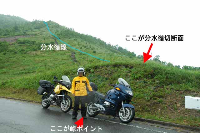 ここは県境から外れている分水嶺。県境はここ国道405号線を左(北)に下った野反ダムの先にある。国道405号線はダムサイトで途切れて、その先は地蔵峠を経て渋沢から切明へ至るハイキングコースとなっており、車はおろか自転車さえも通れない。国道は切明から再び整備されて2005年の豪雪で有名になった秋山郷を経て津南町に至る。 ここは道路を少し切り通したので元の地層の切断面が現れ、道路面から約2mほど高くなっているその断面の一番高い部分がここの分水嶺の切断ポイントとしてよく見える。私はその真下にバイクを停めて、「ここだ、ここだ。」と、はしゃいでしまった。一方「峠」は道路が水平面になったところであるので、バイクのシフトをニュートラルにして前後に押してみてその感覚でそのポイントを確かめた。 この峠は後方の八見山への登山口になっている。 |