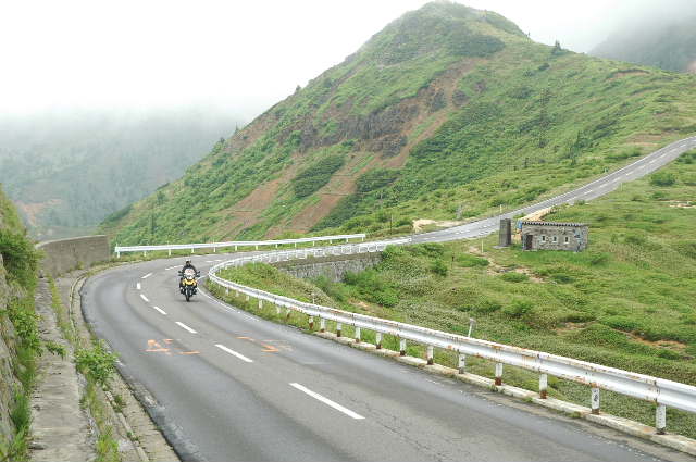 | この分水嶺上の道路(志賀草津道路)の一番低くなったところ、道路が嵩上げしてあるところが山田峠。今は峠越えの道は使われていないが、戦後に志賀草津道路が開通するまでは信州の小布施と上州の草津を結んでいた。向こう側が渋峠方面。建物はこの道路が完成する前に使われていた緊急避難小屋。小屋の前の石碑のように見えるのは濃霧の時に登山者にこの場所を知らせるための警鐘。今はこの小屋とともに草津・志賀の観光資源のひとつになっている。 |