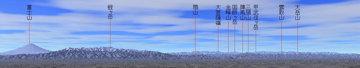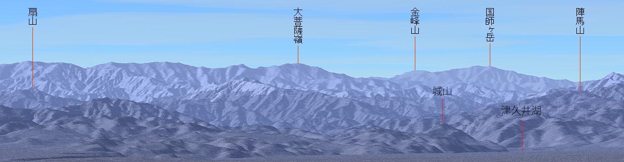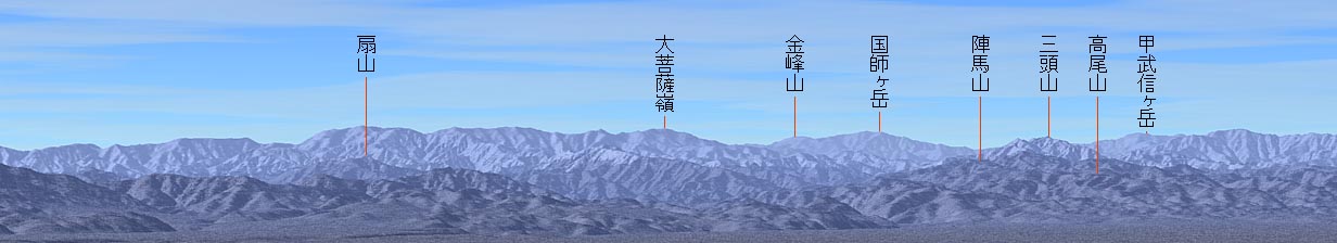 手前の扇山(1,138m)は大月と上野原の間です。 その後方の高い山々は甲州市と大月市の境 扇山の左後方の低いところが笹子峠(1,050m)です。 高尾山(600m)と陣馬山(857m)は東京都の西、相模湖辺り。 その後方の三頭山(1,531m)は奥多摩。 大菩薩嶺と三頭山の間の低い嶺は奥多摩から大月へ抜ける国道