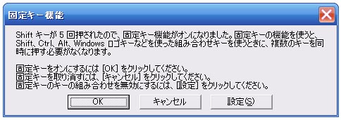この Shift キーの具合を確かめるために繰り返して押していたら、下のダイアログボックスが現れました。 知らなかったのですが、 Shift キーを5回繰り返して押すと、固定キー機能というのが起動します。