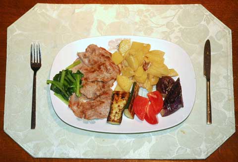 きょうの夕食です。 豚肉のソテー、ズッキーニと茄子の炒め、ジャガイモとベーコンの炒め、トマト、小松菜です。