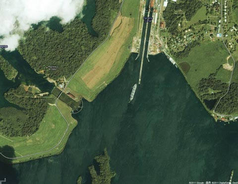 Wikipedia によると、ガツンダムはアースダムとしては世界最大、ガツン湖は人造湖として世界最大、とあります。 ガツン湖を作った目的はもちろん地峡を船で越えるための運河計画の一部です。 日本列島と異なり標高が低い土地ゆえのアイデアです。 このダムの幅は2,300m、基盤部分の厚さ640m, 水位標高26.5mです。 現在は中央部にはコンクリートの幅 225m のアーチ状のオーバーフロー堰が設けられています。 右上がガツン湖からカリブ海へ抜ける運河水路への出入口部分のガツン閘門 (Gatun Locks) です。 写真を拡大してください。 閘門が見えます。