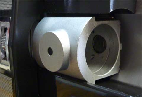 映写機改造 Customizing the projector また、テレシネです。 フィルムを直接撮影する方法の鍵はビデオカメラをできるだけフィルムに近づけることですが、映写機レンズとその前の構造物に阻まれてできませんでした。 そこで、新たに、フィルム直後で光軸を直角に曲げて横から撮影する方法にトライすることにしました。 そのために映写レンズを受けている部品を取り外して、その横に窓を開けることにしました。 その部品です。