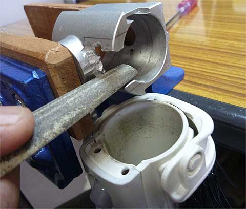 それをヤスリで整形しました。 下から見えている丸い筒はヤスリで削っているときに出る金属粉を吸い取るための掃除機の吸い込み口です。