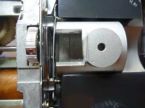 これを取り外すために内部のリンク機構など、数点の部品を取り外しました。 普段絶対に開けることのない機械の内部がこんなに汚れていることを知りびっくりです。 もちろん取り外したときに清掃しました。 もっとも清掃しても清掃しなくても使い勝手や映写にはまず関係しないことも承知ですが、汚いものを見てしまったら放っておくことができません。 フィルムを通して光が通る四角い窓をアパーチャ (Aperture) といいますが、この窓の前後、フィルムが通過して機械と接触するところに硬いチリが付着しているとフィルムにキズを付けます。 その付いた傷がいわゆる「雨降り」です。 映写に関わる人、あるいはフィルムの持ち主が一番いやがるキズです。 何度も映写された古い映画に特有の傷みです。 最初の頃の8ミリ映写機はこの部分が完全にオープンになり掃除しやすくなっていましたが、家庭用の映写機はフィルム装填が自動になって、この部分が開かなくなってしまいました。 16ミリ映写機は業務用に使われることが多いので大抵の映写機はこの部分がオープンにできて、掃除しやすくなっています。 しかし、このオレンジ色の大きいゴミは一体どこから出てきたものでしょうか。 この部分にほこり溜まるのはおそらく内部の熱除去用のファンによって、この角の隙間から空気が吸い込まれているからだろうと思います。