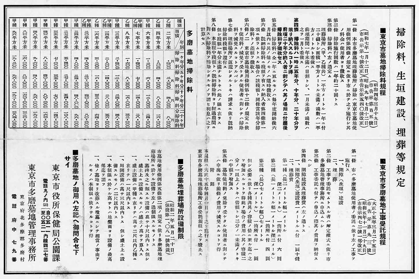 最初は東京市の多摩墓地の使用条例と各種規程です。 掃除料は前払いで1年間から20年間まで規定されています。 この掃除料規程の第4条に20年分を収めるとその後は払わなくてもよいと書かれていますので、その時に上の「永掃」のエンブレムが取り付けられたようです。 この掃除は1年間に20回もしてくれていたようです。 さて、この規程、今は有効ではないようです。 下の4つの画像はクリックすると大きい画像が見えます。
