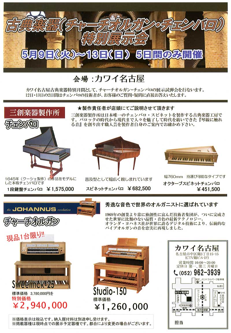 三創楽器 Sanso Musical Instruments 浜松の三創楽器製作所から名古屋での古典楽器の展示会の案内が来ました。 三創楽器は以前に私がヤフーオークションで手に入れた東海楽器のスピネットチェンバロの部品を作って供給している会社です。 そのチェンバロはこのパンフレットの真中に掲載されているような楽器です。 私の持っているチェンバロは40年程前に製造販売されて、かなりの台数売れたのですが、30年くらい前に製造と販売が終了しました。 今回、この楽器を改良した新しい製品の製造と販売を始めたようです。 この30年ほど見向きもされなかったマイナーな楽器が、見直されて、需要ができてきたのでしょうか、珍しいことです。 値段は発売当時の3倍以上になっています。