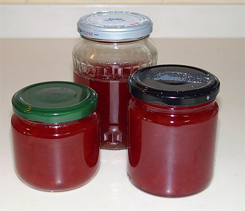 作り方は前と同じですが、前回はやや甘すぎたので今回は砂糖はいちょう切りにした実700g に対して50%、350g にしました。 剥いた真っ赤な皮はみじん切りにしてお茶パックに詰めて実と一緒に圧力鍋で10分間煮て、後にパックは取り出します。 とても良い色が出ました。