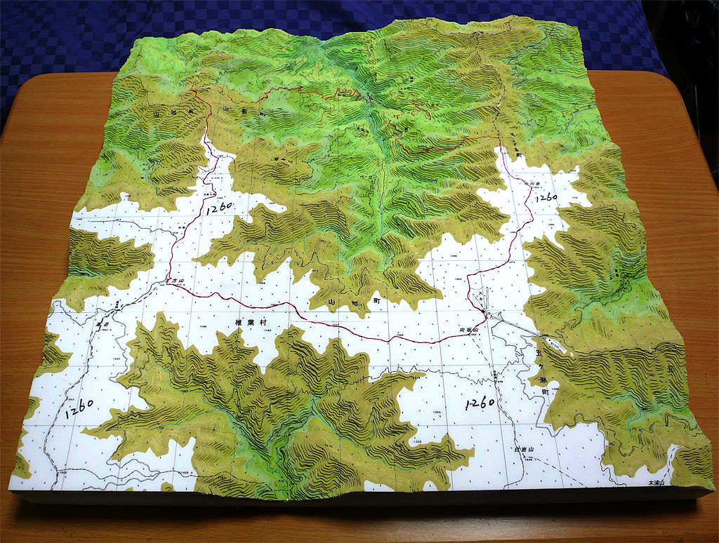 立体地図 Relief map 先日、国土地理院の元幹部を務めた方と知り合いになりました。 この方は測量と地図に関する行政のプロのみならず、一方ではまた「地図学の権威者」でもあります。 そこで、私が以前に作成した「九州脊梁山脈トレイルラン」と名付けた立体地図を見てもらいたくてその写真をメールで送付しました。