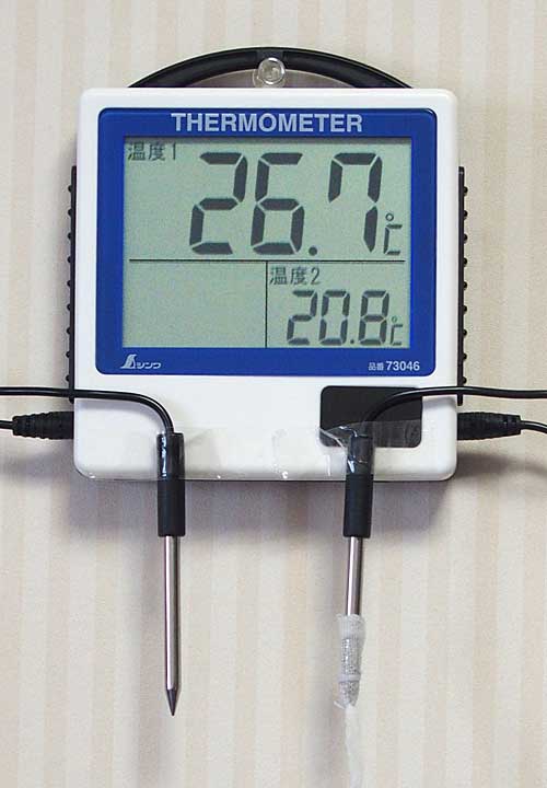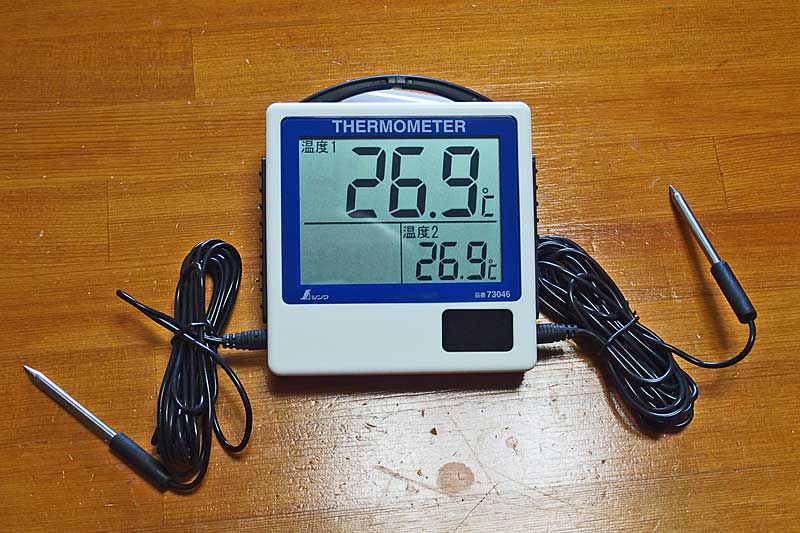 そこで閃きました。 精度の高いデジタル温度計を二つ使う方法です。 うまい具合に2か所の温度を同時に測定できる測定器専門メーカーのシンワ測定の簡易デジタル温度計が見つかりました。 主に農業用にハウスの外と土の温度を同時に測定するような時に使われるものです。 アマゾンで 3,186円で買いました。 測温部 (プローブといいます) が3mのコードで繋がっており、防水です。 これの片方の先端にガーゼのウィックを巻けば即席のデジタル乾湿湿度計です。 湿度は乾球と湿球の温度差を基に計算されるので、温度計そのものの精度は余り問題ではなく二つの温度が全く同じ値を示していることが重要です。 この個体はその条件を満足しています。
