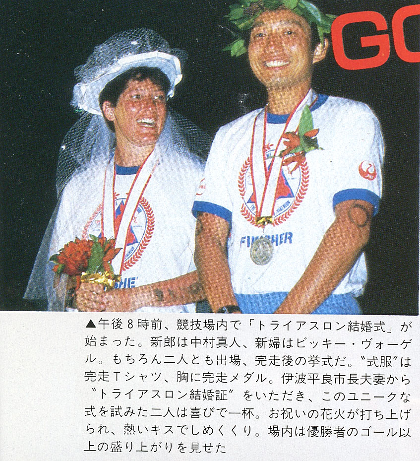 私も自分の部屋から飛び出してかけつけると、テレビ朝日の「世界の村で発見! こんなところに日本人」という番組です。 この番組で紹介されていたのは昔のトライアスロン仲間の中村真人さんと奥さんの Vicki Vogel さんの家族でした。 二人とは1985年8月11日 (翌日の夕方日航ジャンボ機が御巣鷹山に墜落して520人が死亡) に千葉県の館山の遠泳大会の帰りに東京湾フェリーの船上で一緒になりました。 中村さんはその年の4月に宮古島トライアスロンに出場していたこともあって気が合い話が弾み、その後一緒にトライアスロンの練習をする仲になりました。 翌年の1986年の第2回宮古島トライアスロン (私は設立したばかりの日本トライアスロン協会の理事長として大会運営に参加したので出場せず) の時には中村さんと Vicki はこの大会に出場完走し、この大会の表彰式パーティの際に、全出場者や関係者が見守る中、「トライアスロン結婚式」をあげました。 その「トライアスロン結婚式」はテレビ番組の中でも写真が紹介されていましたが、下の写真と記事は雑誌「トライアスロン 通巻6号 1985年11月 ランナーズ社発行」に掲載されたものです。