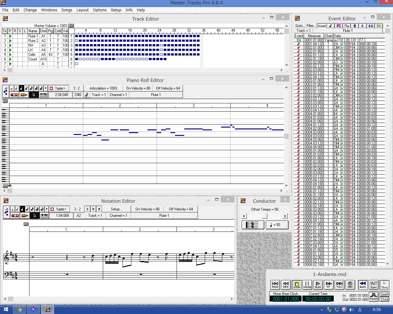 シーケンサー Sequencer software フルートアンサンブル練習の課題曲は ゲオルク・フィーリプ・テーレマン (Georg Philipp Telemann 1981-1767) の Tafelmusik 第3巻の Trio D-dur (2本のフルートと通奏低音) TWV42:D5 です。 使用楽譜は Amadeus の通販で入手した Camera Flauto Amadeus シリーズ No.9 (BP369) です。 効率の良い練習のためにいつもの通り楽譜を シーケンサーで「打ち込んで」MIDI ファイルを作成しました。