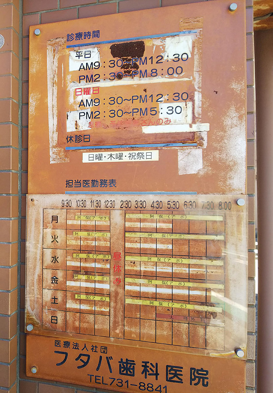 に変更され、日曜日は休診日になって久しいが、それを訂正することもしなかった。 日曜日の診療時間の下に「・・・・・・さんのみ」と書いてあるが前半部分は全く解読不能である。 本当に日曜日に「・・・さん」の診療をしていたとは思われない。