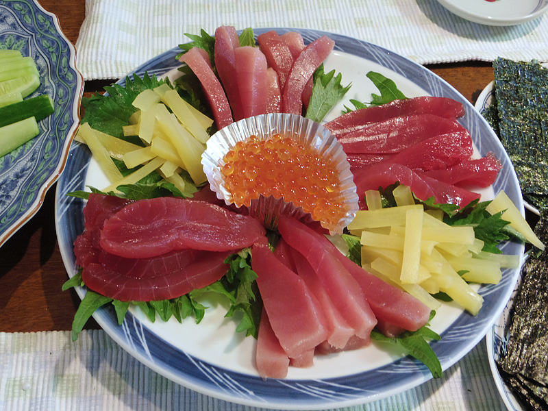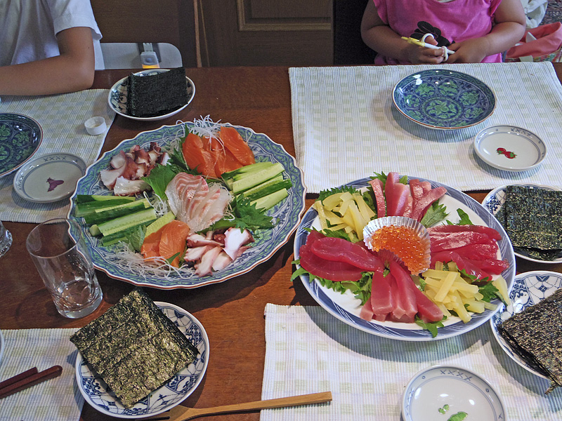 午後になって次男の一家が遊びに来たので、夕食はみんなで楽しめる手巻き寿司。 タコとカッパ巻は孫たちの大好物。 豪華な食事だけど、きのうの反省もあり次男が車の運転で飲めないのでアルコール抜き。