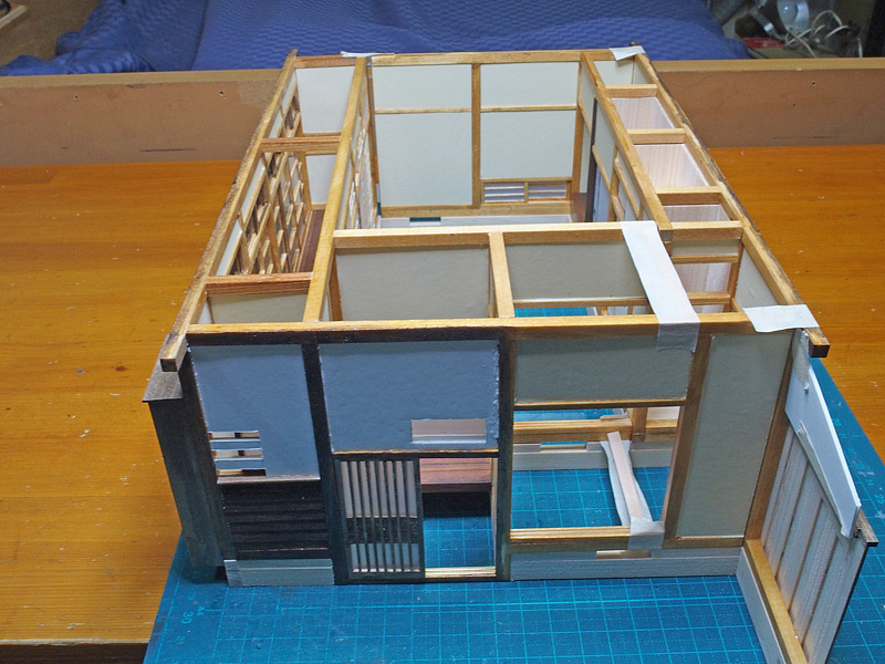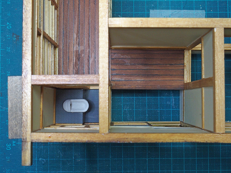 玄関ブロックに含まれるトイレの壁と便器の取り付けが終わってこのブロックは完成である。 南側の廊下ブロックと合体させる。 すべてのパーツをきっちり寸法通りに製作したので合わせてもぴったり。