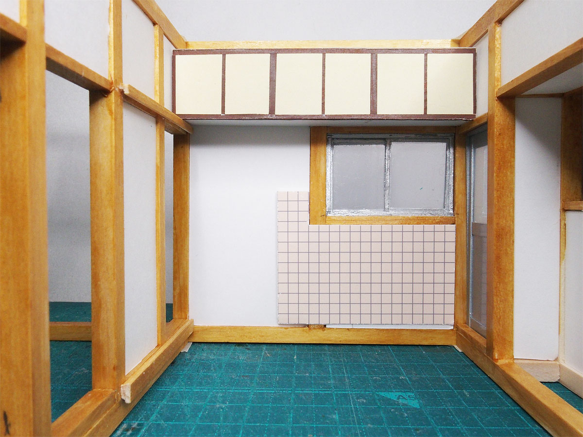 この外壁の出窓はブロンズのアルミサッシである。 おそらく改築した時に付け替えたものと思われる。 北側の壁の窓の下の壁は10cm角のタイル張り。 ここに洗濯機を置いていた。 どうやらこの家を設計した義兄が洗濯機置き場を風呂場・洗面所近くに設けることを失念していたようだ。 タイル光沢感を出すために写真用紙の光沢紙を壁の下地に貼ったらそれらしくなった。 タイルの数と位置も本物と同じ。 タイル壁の足元に隙間が見えるが床の高さが土台の上端から