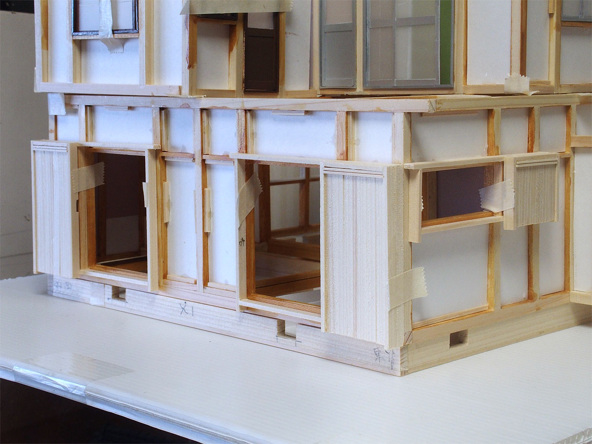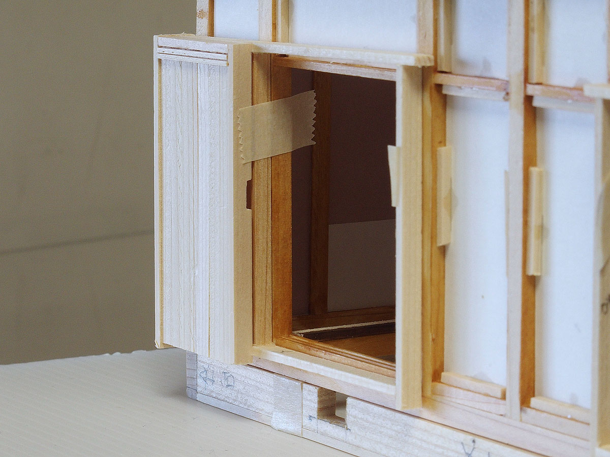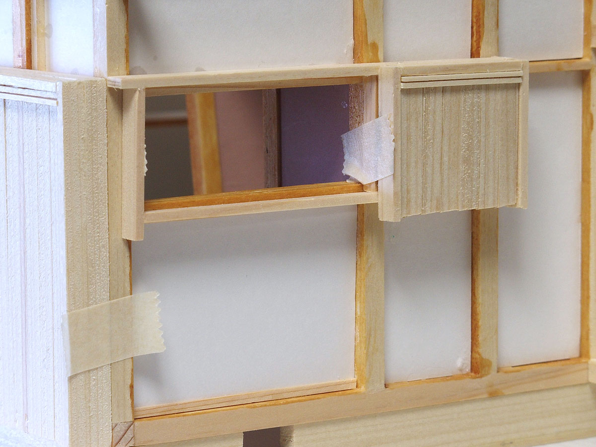 これまでに作ったサッシ窓と扉の枠はすべて柱の内側にはめ込む「内付け」 (風呂・洗面所・トイレなど) または「半外付け」(2階和室など)であるが、1階和室 (リビング) の南側の扉と東側床の間の窓はそれぞれ障子が入っており、アルミサッシは柱の間にはめ込むのではなく柱の外側に取り付ける「外付け」である。 そのサッシ扉やサッシ窓の枠と雨戸をしまう戸袋を作った。