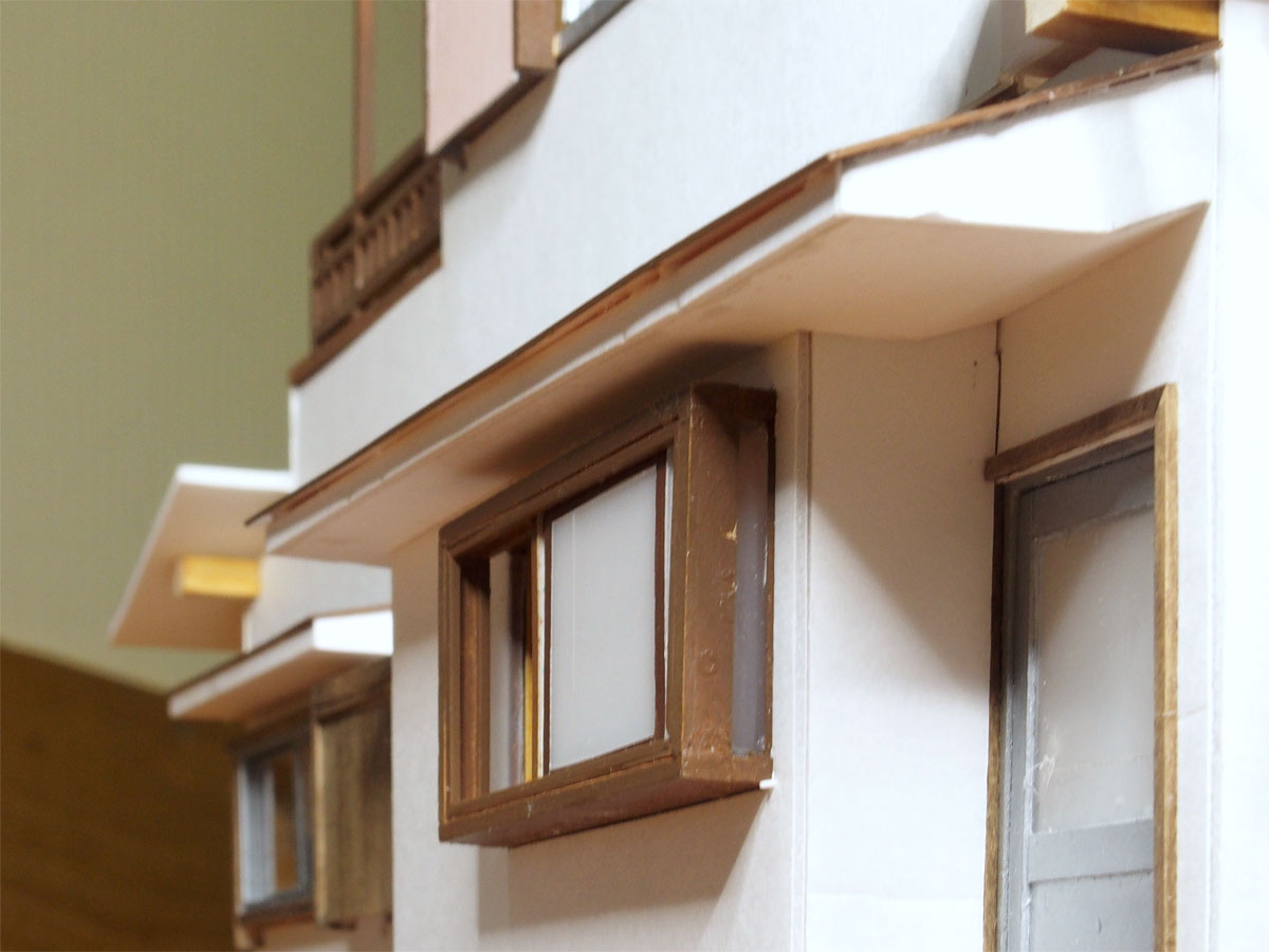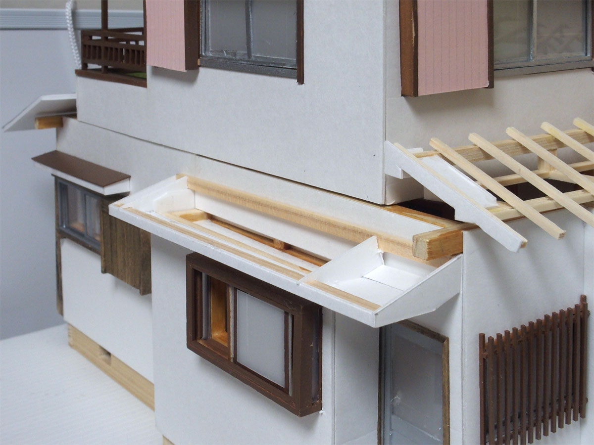2階南西側の窓の庇。 手前の増築部分の部屋の窓の転落防止策と雨戸は未完。
