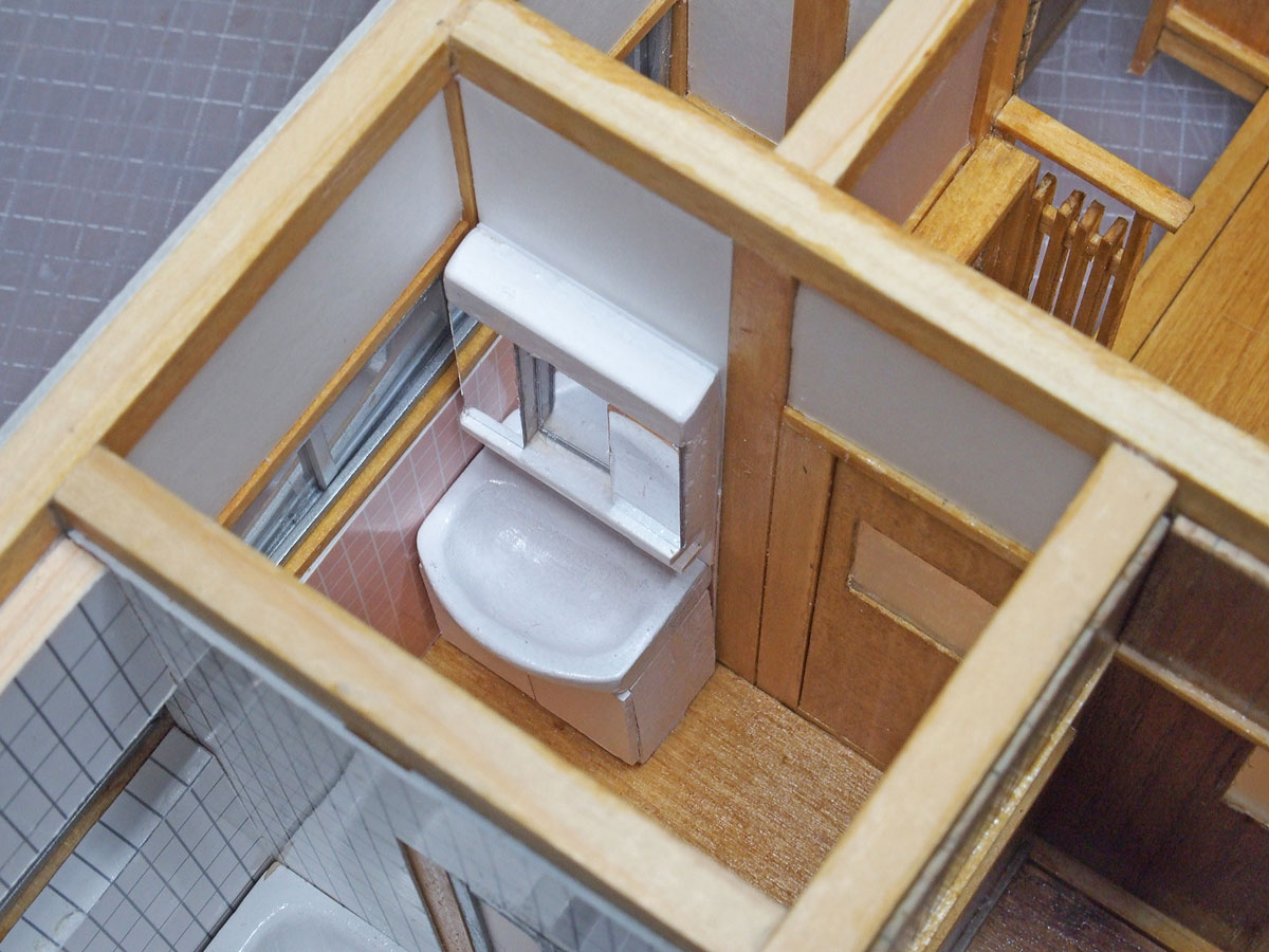 洗面台の上部キャビネットに鏡を入れ、下キャビネットの扉をさらにそれらしく作り直した。