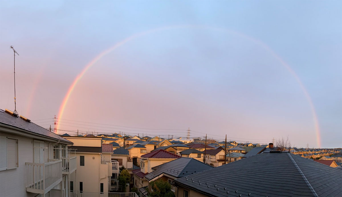 次男からLINEで送られてきた見事な二重虹の画像