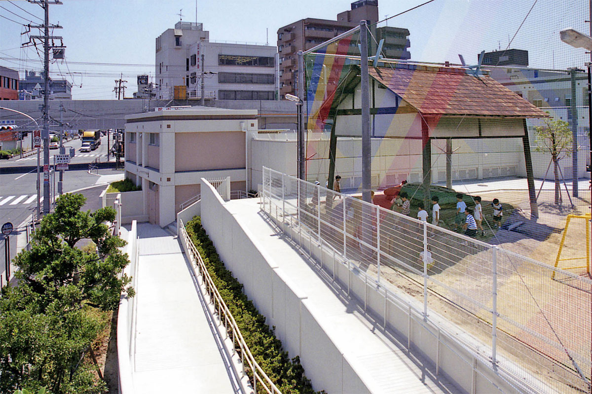 歩道橋から西を見る。 ここは昔は一段下がっており、私たちが5年生の時にできたプールがあった場所である。 学校と伊丹街道の間に「河合事務用品店」の建物が見える。 昔から敷地が限られていたのでとても細い建物である。