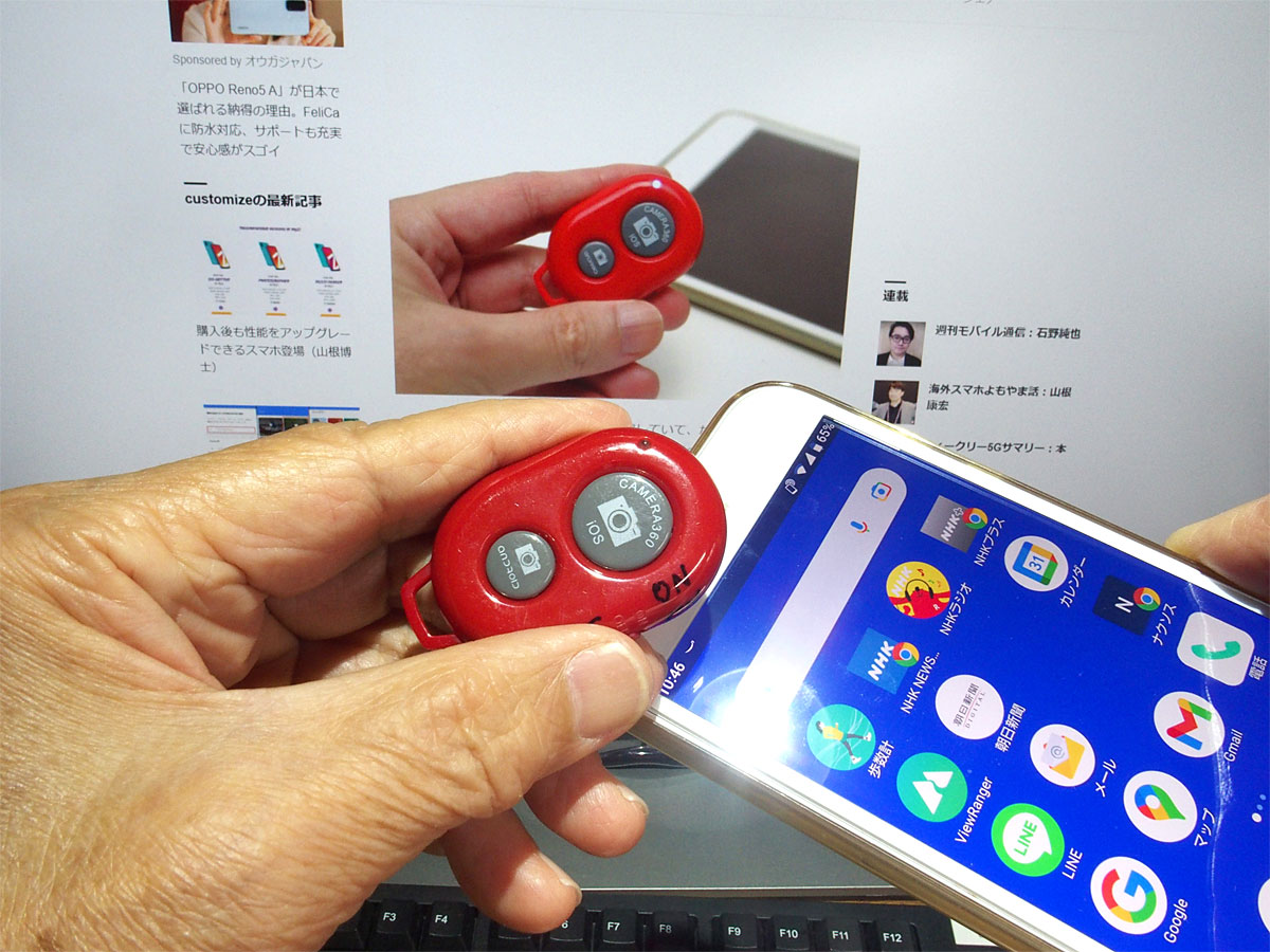 が分かるように明記した。 スマートフォンを離れたところに置いて自分を撮影したり、いわゆる「自撮棒」に取り付けて撮影するときに使うためのものだろうが、そんな機会はまずない。