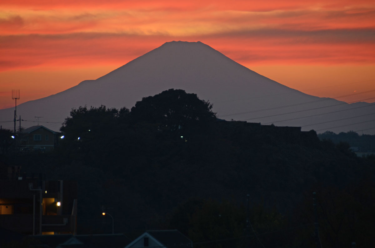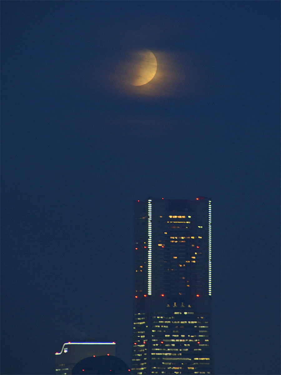 月食とランドマークタワー。 この後すぐに雲の中に姿を隠してしまった。