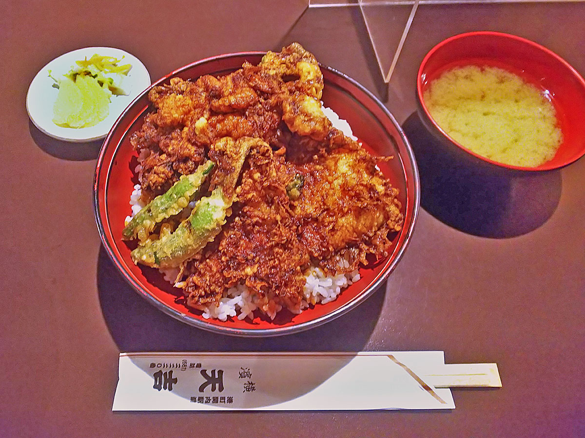 メニューを事前に調べて「濱天丼」に決めていた。 小さいかき揚げ、キス、いか、ししとうの四品。 天丼のたれはこの店の「売り」なのだろう、つぎ足しつぎ足しで煮詰めたのか異常に濃くて焦げ臭い。 さらに揚げ油の臭いがきつくて、それらの臭いが鼻について一度食べたらもうたくさんという感じ。 安くて口に合う天丼なら「てんや」のほうがよかった。 この店にはもう二度と行くことはないと思う。