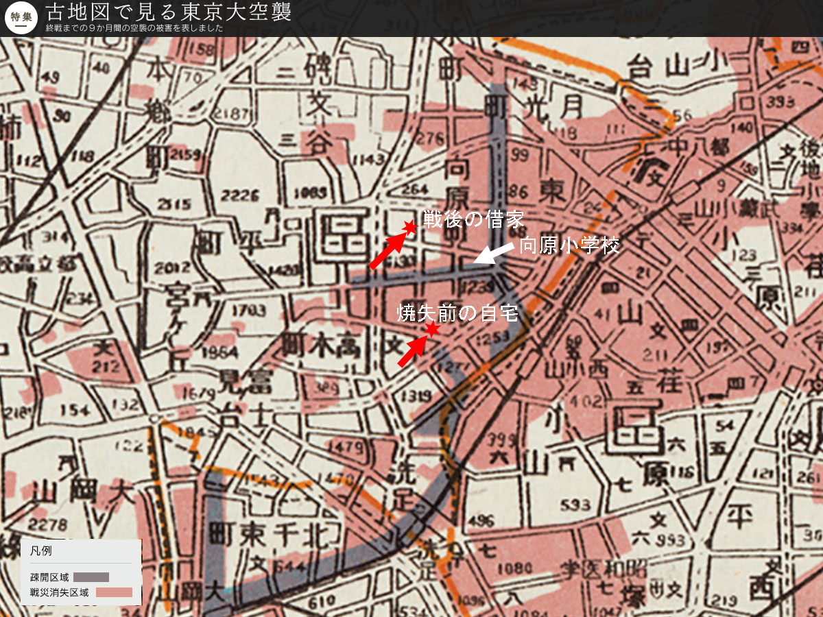 焼失前の原町の家は私は全く知らないし、場所も分からなかったが戸籍に記載の地番から現在の住所を割り出して特定できた。 上の地図でグレーの「疎開区域」では、爆弾投下によって延焼を防ぐために道路に沿った家屋を強制的撤去した。 目蒲線洗足駅と大岡山駅間や大岡山駅北側の北千束町の南北道路の疎開は効果があったように見受けられる。