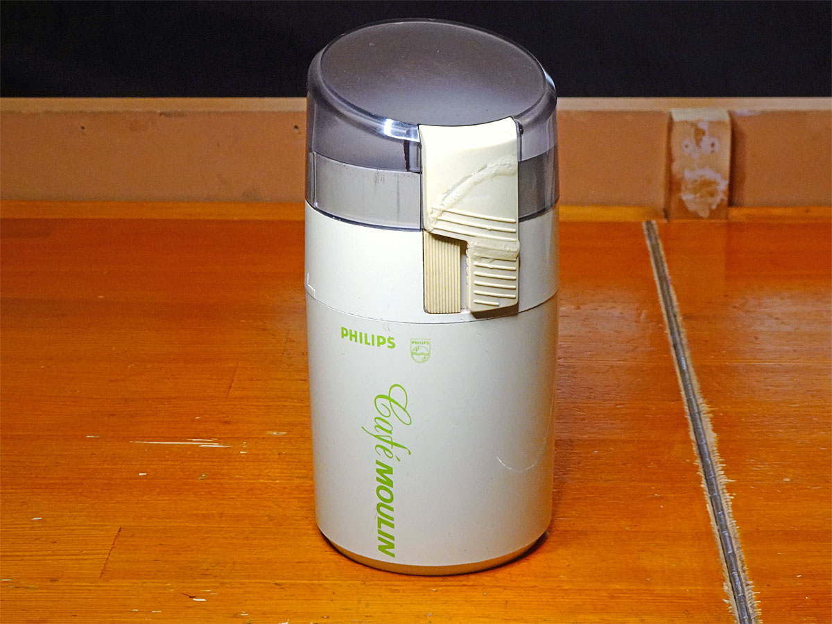 はもう40年以上も使い続け、その間にあちこちが壊れたがその都度修理してきたものである。 今回の破損を機会に新しいコーヒーミルに買い換えようかと思って現在市販されているいろいろな製品を調べてみたが、このモデルの特長であるコードの巻取りができる製品が見つからなかった。 この機構はとても気に入っているので仕方なく同じ製品をヤフオクで探したところ新品ではないが出品されていたので即決で落札した。 落札価格は現在市販の同様なコーヒーミルの新品の値段と同じ程度だが仕方がない。