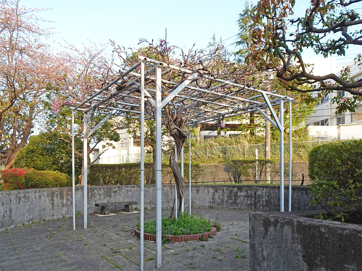 (こんなしゃれた名前で呼ばれている) の藤棚。 1976年に入居して最初に植えられていた桜の木が2年ほどで枯れてしまったので、私が自治会長をしていた時に自治会の事業として作った藤棚なので思い入れが深い。 藤棚の材料は木質が良いのだが長持ちしないことが分かっていたので敢えて無粋な鉄骨と鉄管を採用した。 その後藤の木は見事に伸びて今頃は長く花を垂らしていた。 管理は住宅管理組合に移管したので、棚の錆止め再塗装もきちんと行われて藤の木も庭園業者がよく面倒を見てくれる。 しかし枝が伸びすぎて10年ほど前に大きく剪定したのでそれ以後は花の着きがやや寂しい。 これからの1ヶ月が見ごろである。