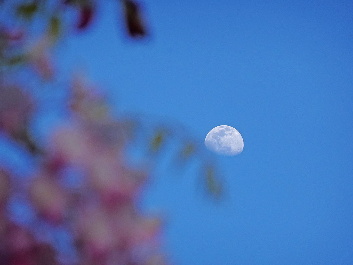 下から見上げると丁度月齢12日の上弦の月が昇ってきた。