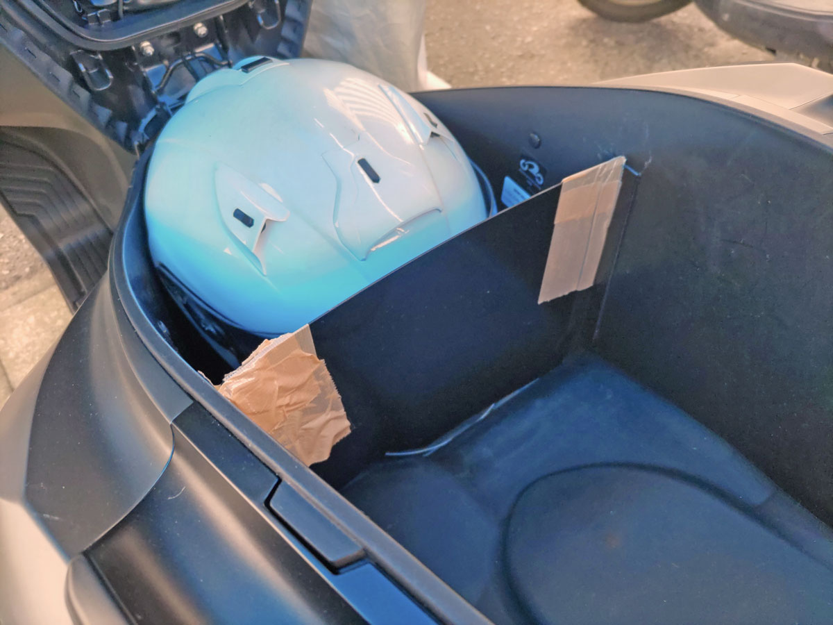 2日の日記に書いたスクーターのシート下のパーティションの失敗、すなわち板を支えるレールに使用したプラスチックアングルの破損、当面はガムテープで補強して使っていた。