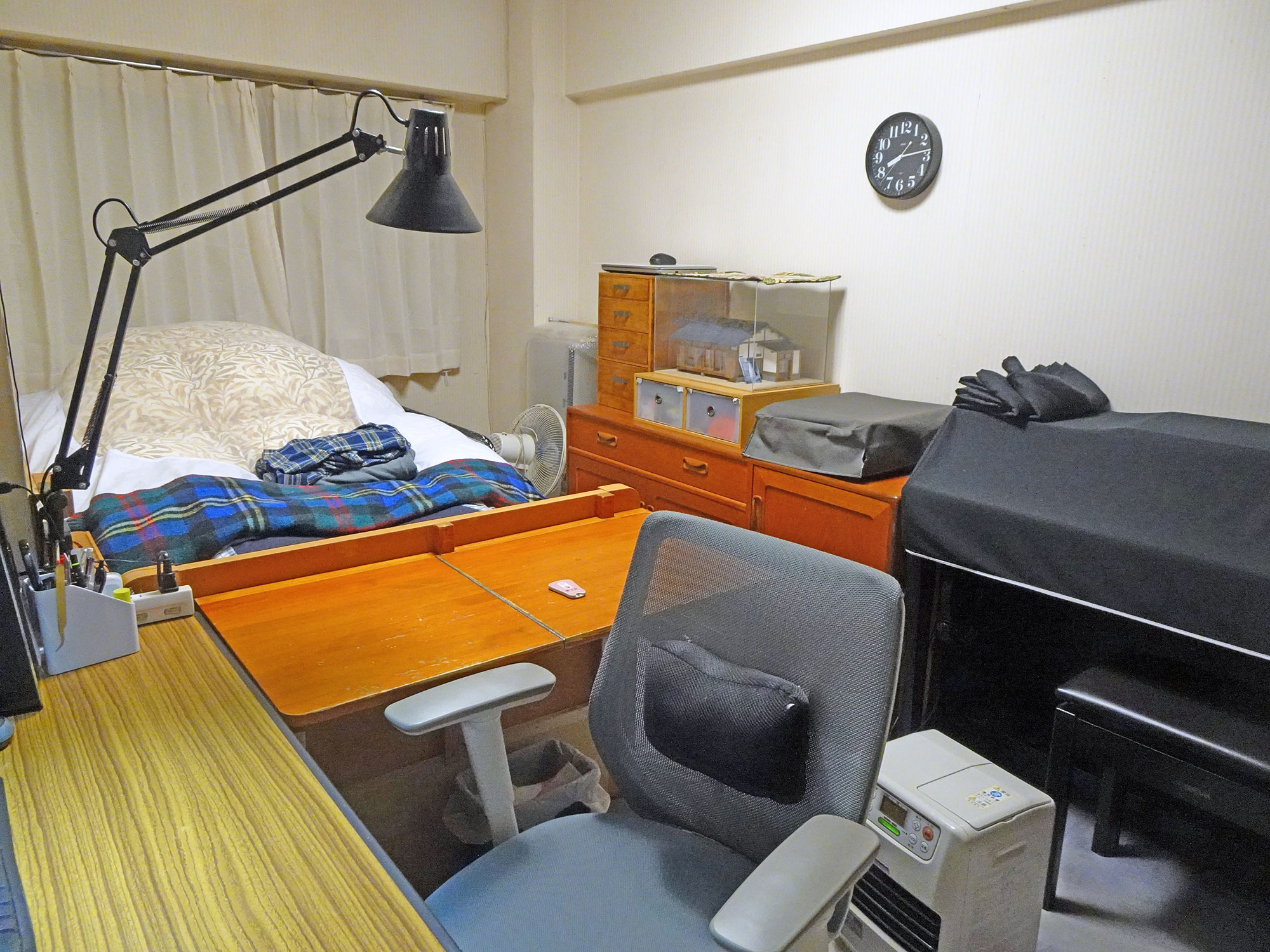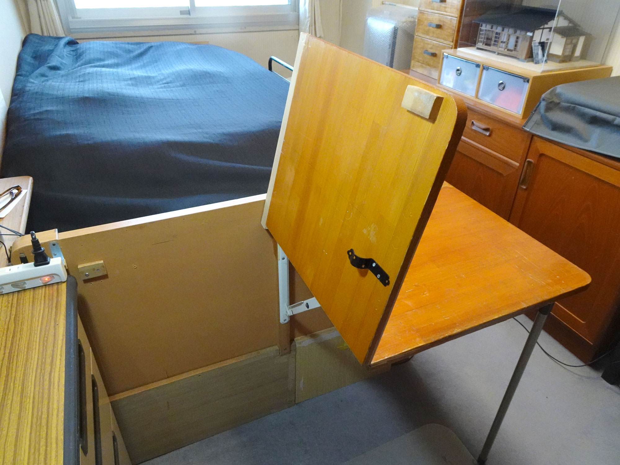 クラビノーバの上の黒い布はベッドカバー。 プリンターとクラビノーバには埃除けのカバ―をかけている。 ベッドのヘッドボードには折り畳みのテーブルを取り付けたが極めて便利で重宝している。 抽斗の中のものを取り出すときには、左側を跳ね上げる。