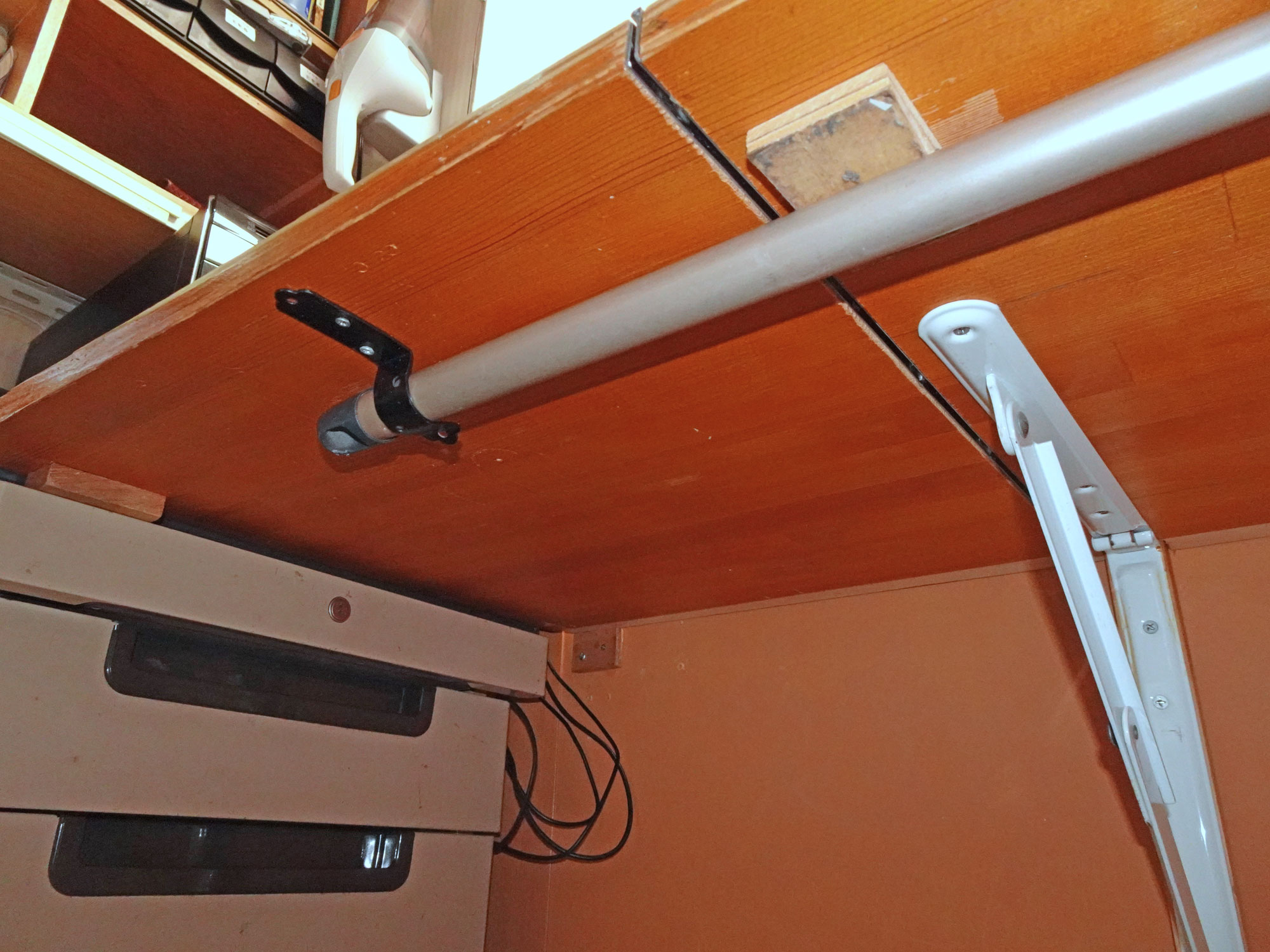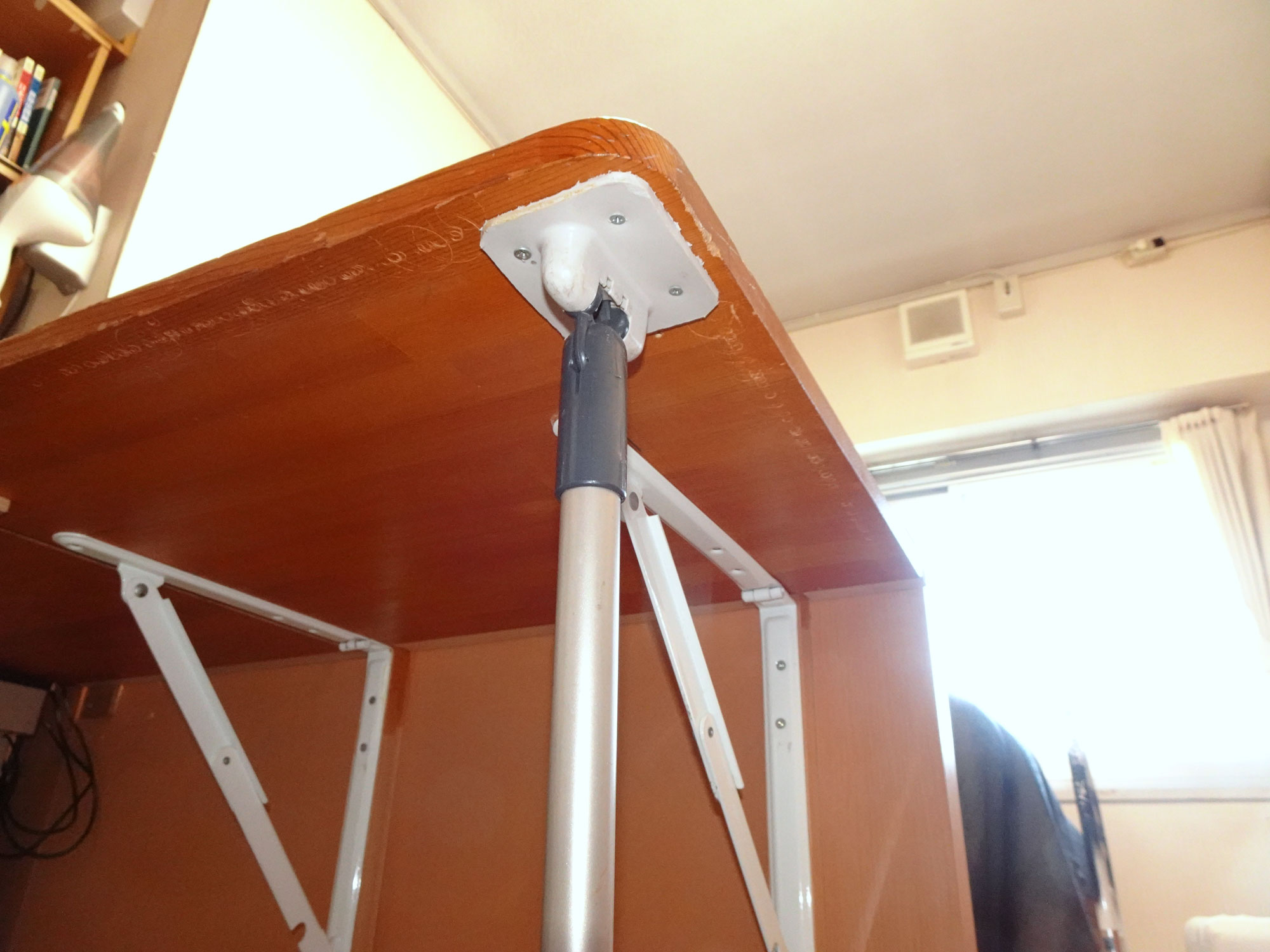 (右上の画像)。 左側はヘッドボードに取り付けた木片と最上段の抽斗(右下の画像)で支えらるようにした。 相当重い物を載せても大丈夫。 テーブル右手前下の足の棒は床掃除モップのヘッド部分を利用して、自由に動くようにし、棒に足を引っ掛けても払われた棒先は自由に動いてヒンジ部分に無理な力が掛からず壊れないようにした(左下の画像)。 この足はテーブルを畳んだ時には、テーブル下左側の金具に挟み込んで、テーブルを折り畳んだ時には左側の板がグラグラせずにしっかりと固定されるようにした