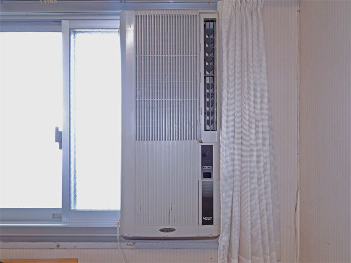 窓サッシを交換した後、既存の窓枠の内側に別の窓枠を設置したことによりこれまで使っていた窓用エアコンの枠の取付け