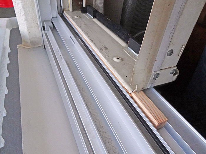 (室内側) にあった溝にこのような2本の木の棒を置いてその隙間に枠の下部のでっぱりを挿入することで枠が固定できた。 細い方の木片にテーパーを付けて押し込むことによってがたつきなくきっちりと固定できた。 「上立ち下がり」を引っ掛ける部分は標準的な方法で固定できている。
