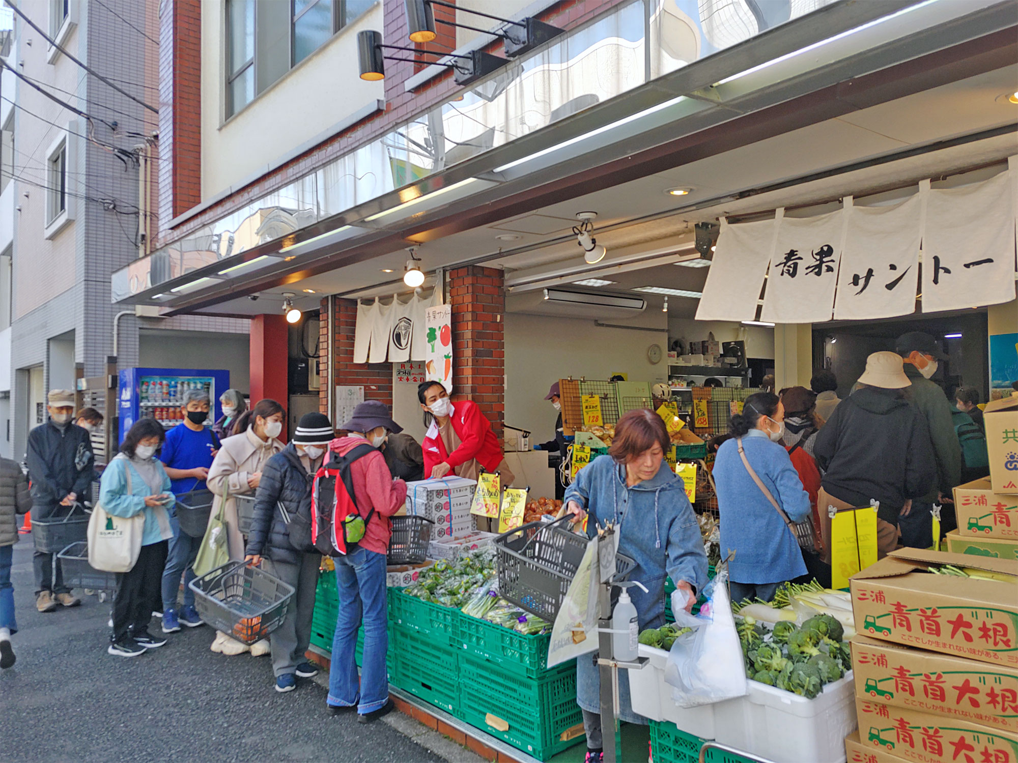 天王町の珈琲問屋へ行ったら並びの八百屋でいちごパックを298円で売っていた。 この八百屋は週に3日しか営業していない安売り店で店の外と中に30人ほどが行列していた。