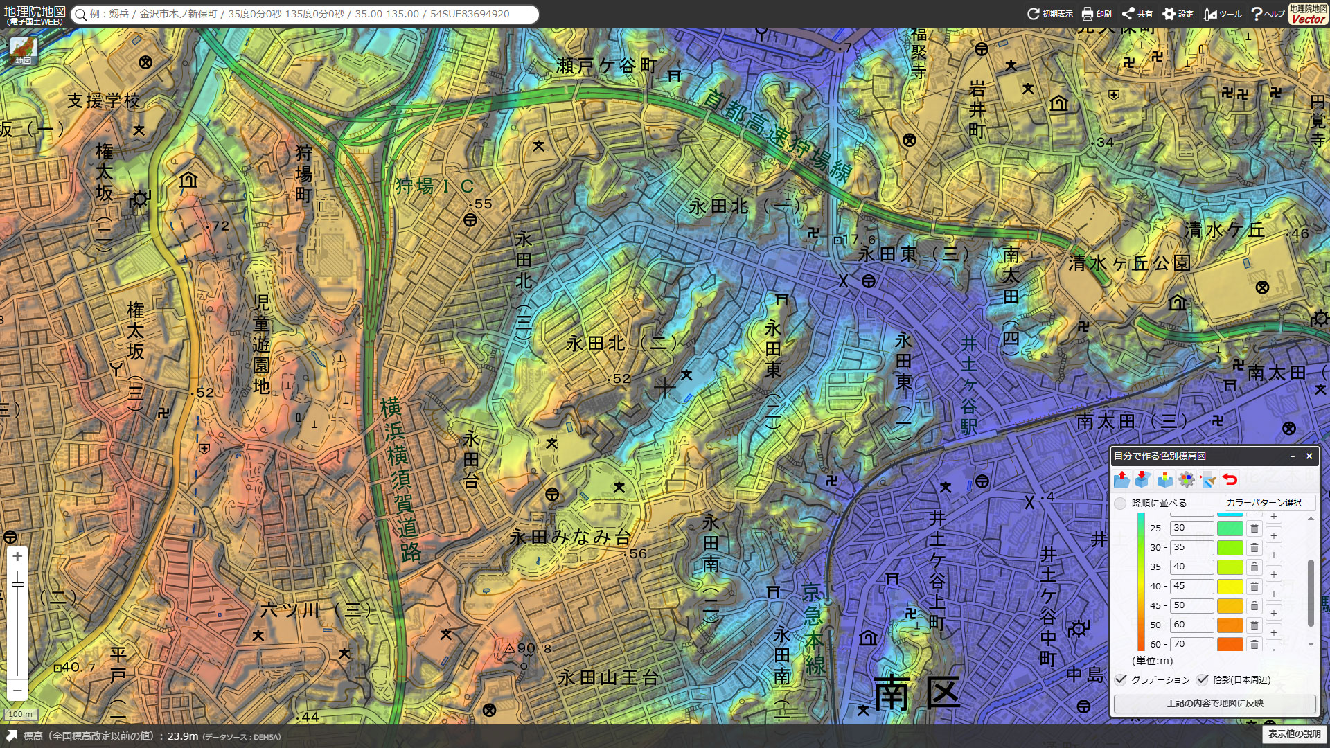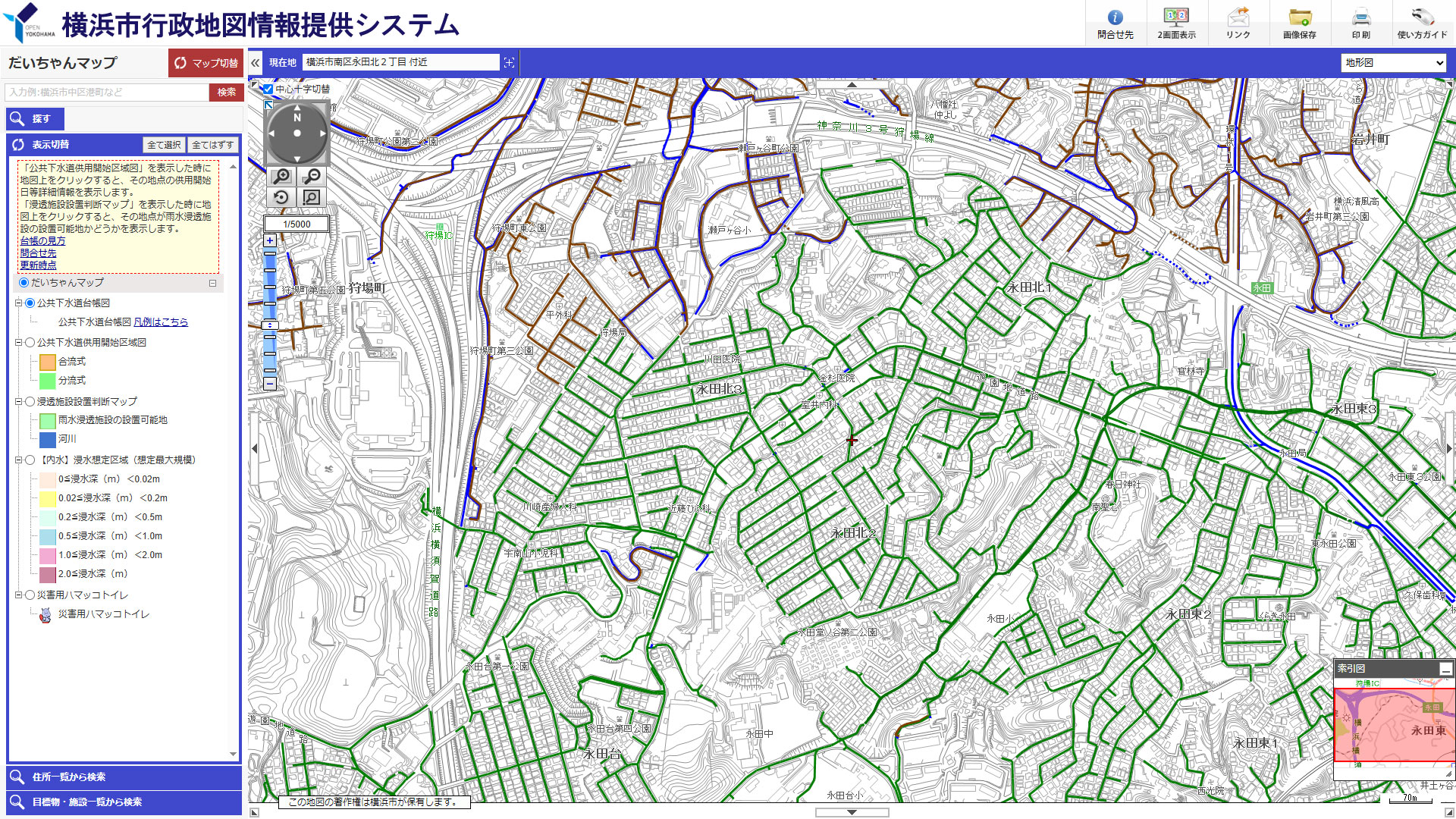 中央は永田川・大岡川水系