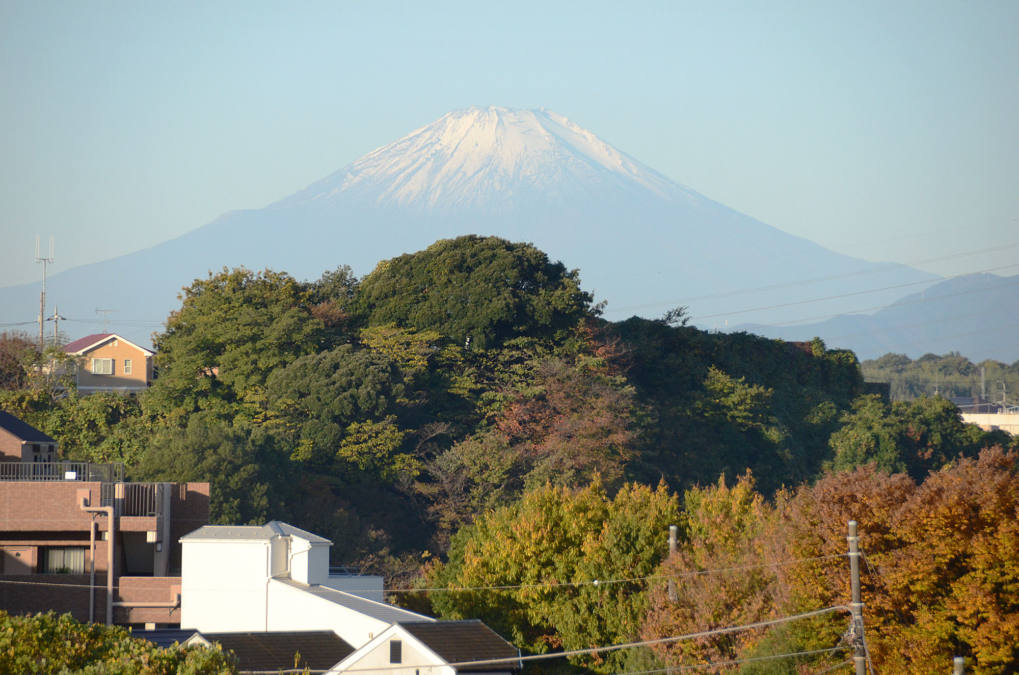 久しぶりの富士山。 やや霞んでいるがまだ雪が少なく登山道も見える。