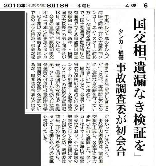 今日の朝刊の記事 「タンカー損傷の状況判明」へ