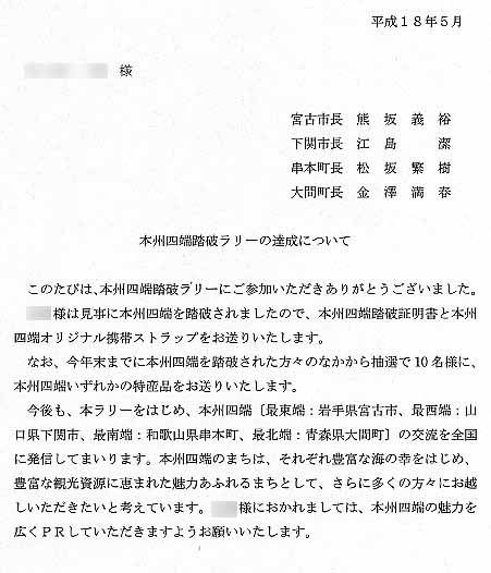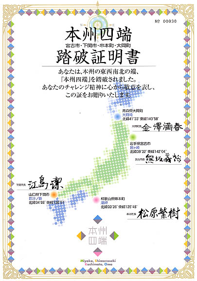 本州の東西南北の最端地を踏破したのでそれぞれの市長さん、町長さんの直筆の署名の入った証明書と携帯電話ストラップをいただきました。