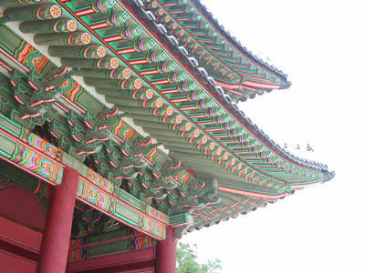現地ツアーガイドの若い女性パクさんの流暢な日本語とあたりのやさしい案内で、私たち二人だけのワゴン車で空港から市内へ。 高速道路の通るこのあたりにはお墓が多いのだが、昨今はお墓の土地が足りないという。理由はキリスト教なので土葬だからとのこと。この辺りの山には木が少ないので日本の風景との違いを実感する。オンドル(温床)で燃やすために、切り過ぎたのだろうか。組織的な植林事業がなかったのだろうか。それともこれが自然の形なのだろうか。青瓦台付近では絶対に写真をとってはならないとの強い申しつけと、その周辺の厳重な警備ぶりに、朝鮮戦争は休戦状態であってまだ終っていないことをあらためて思い知らされる。ソウル市内には多くの宮殿がある。その一つチャンドックン(昌徳宮)で朝鮮の宮殿建築を始めて見る。6世紀に日本列島に仏教が伝わって、そこでの展開を通して日本独特の建築と文化様式となっているが、ここ韓国で維持され又は復元された歴史的建造物はまた朝鮮特有の様式を今に伝えている。まず違いはやはり彩色と開放感と明るさ。共通のルーツが違う道のりを通って発展して異なる結果を見ることによって、見慣れた日本の寺や城や宮が漂わすわびさびが、日本独特のものであることに合点する。その中間に琉球王国であった沖縄を見た。屋根の上の獣達。